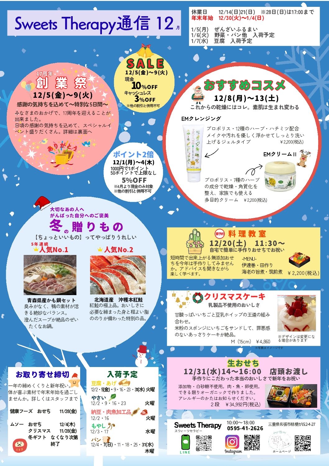 12月の定休日は、14(日)21(日)、年末年始は 30(火)~1/4(日)で…